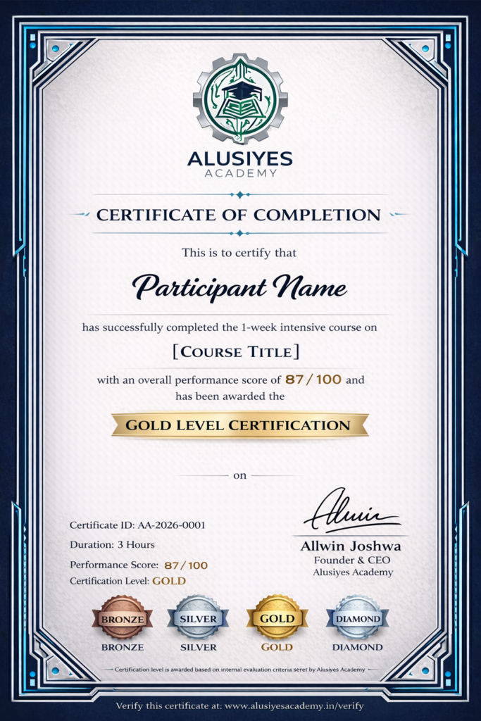 Our course certification recognizes the knowledge, and skills students gain through our training programs. Each certificate is awarded after successful completion of the course and evaluation process. Participants receive certification based on their learning performance and participation. Our evaluation process includes assignments, project work, and overall engagement during the program. Certificates may be awarded in different levels such as Bronze, Silver, Gold, and Diamond. These levels reflect the participant’s performance and achievement throughout the course. The certificate includes the student’s name, course title, score, and certification level. Each certificate also contains a unique certificate ID for verification purposes. Our certification aims to motivate students to develop strong technical and analytical skills. Through this recognition, we encourage continuous learning and professional growth in engineering fields.